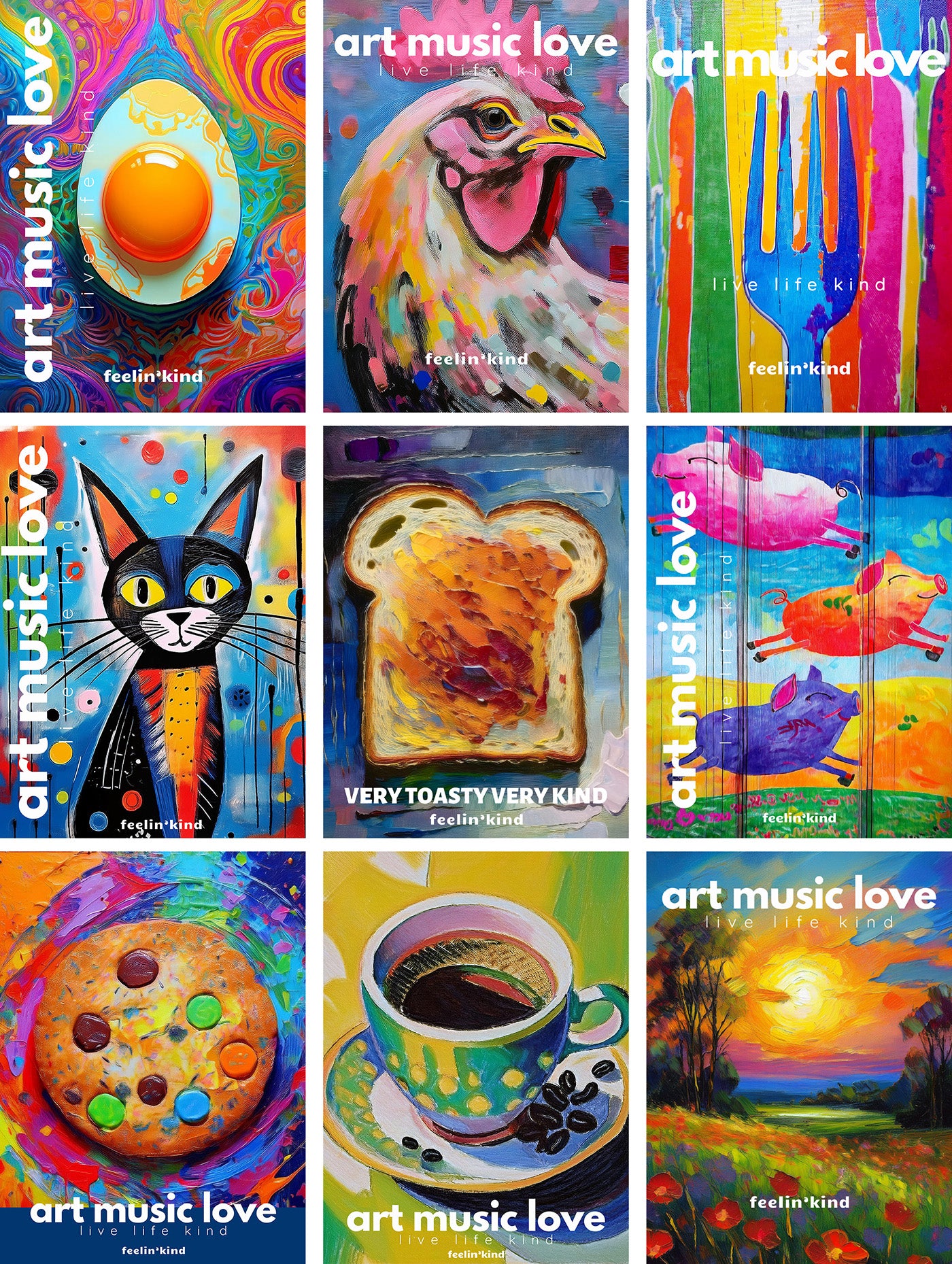 Embrace the vibrant fusion of art, music and kindness with our expressive and colorful designs. Each piece is a unique celebration of life and creativity, from whimsical animals and breakfast delights to scenic landscapes and soulful still-life. Add a pop of color and joy to your collection.