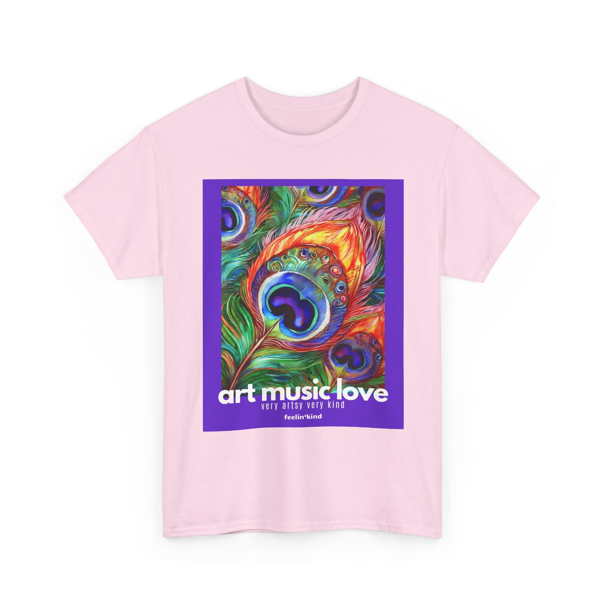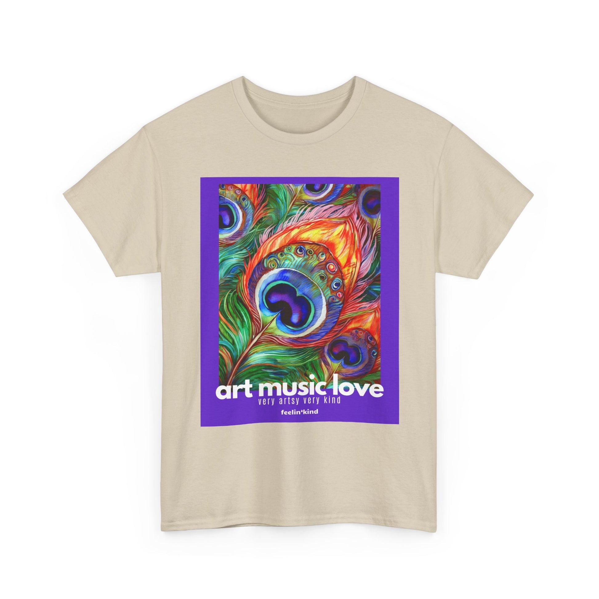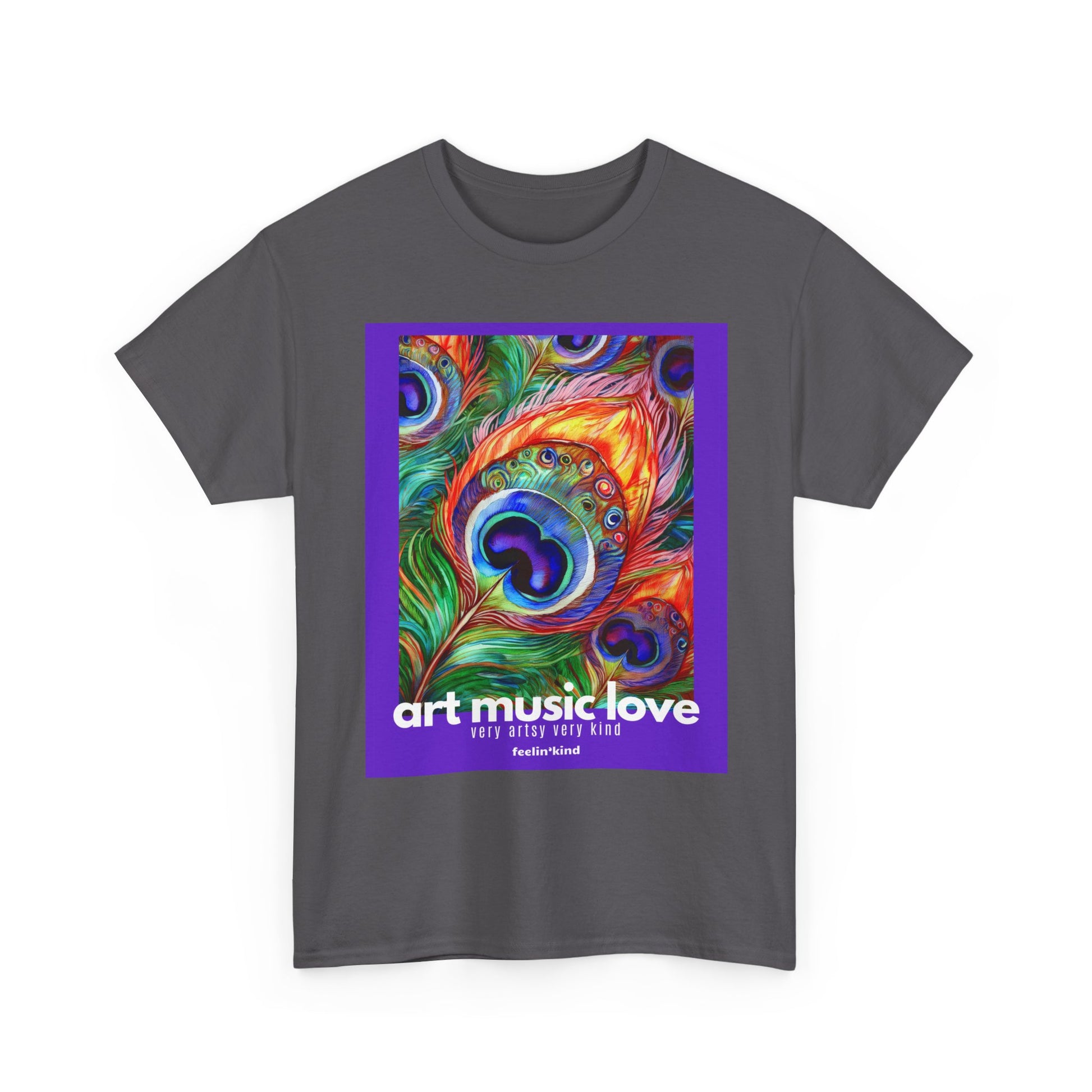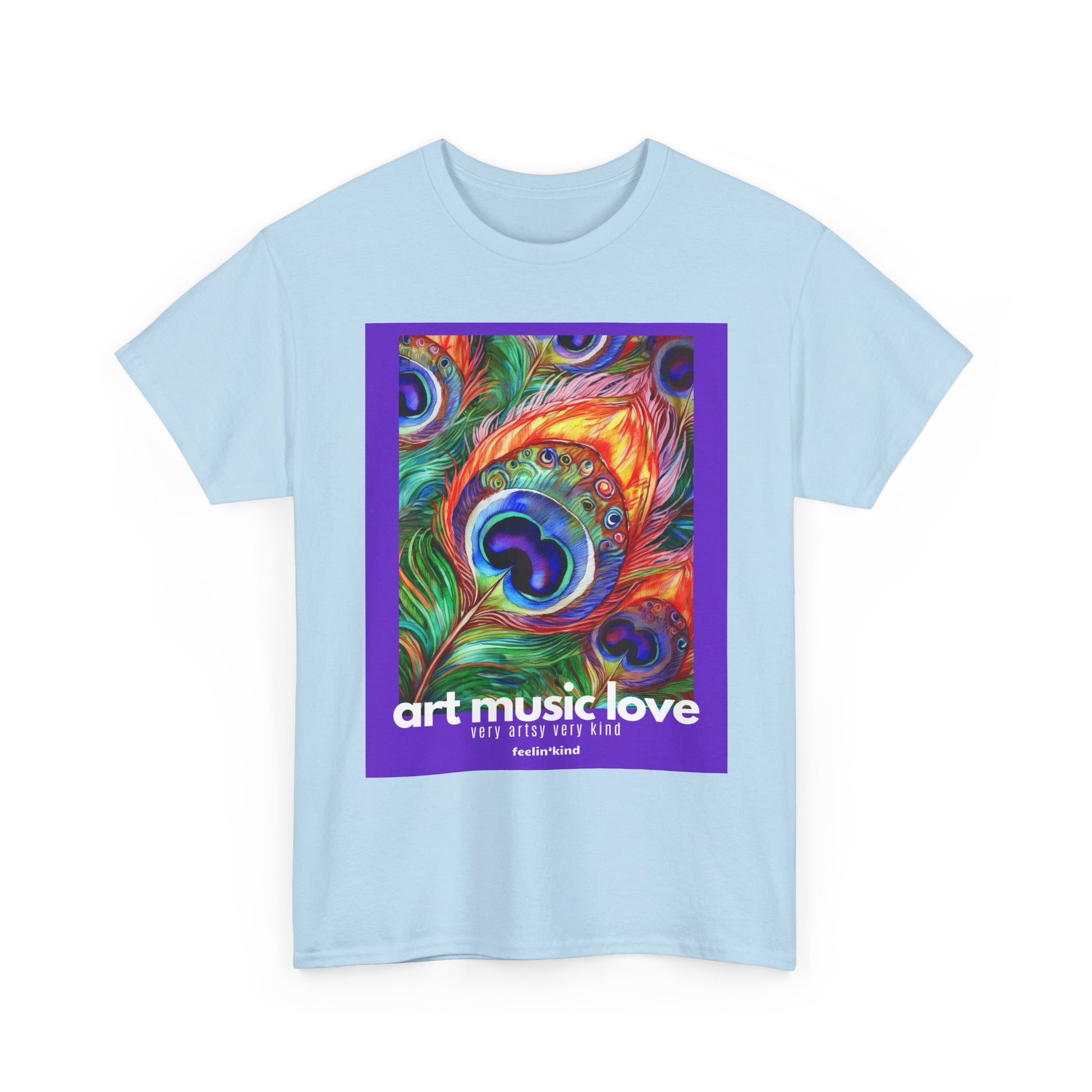 This relaxed cotton tee carries a vibrant, art-forward print that celebrates creativity, music and love. The bold, painterly panel on the front brings peacock-feather colors—emerald, magenta, cobalt and flame—into a wearable canvas. It sits on a classic crew-neck silhouette with a roomy, comfortable fit, making it an easy layer for gallery nights, laid-back gigs, or days spent sketching and listening to records. The fabric feels sturdy yet soft, holds prints crisply, and wears well over repeated washes. Lightweight enough for year-round wear, this shirt reads like a statement piece without fuss—an expressive everyday shirt that sparks conversations and complements a creative wardrobe.
