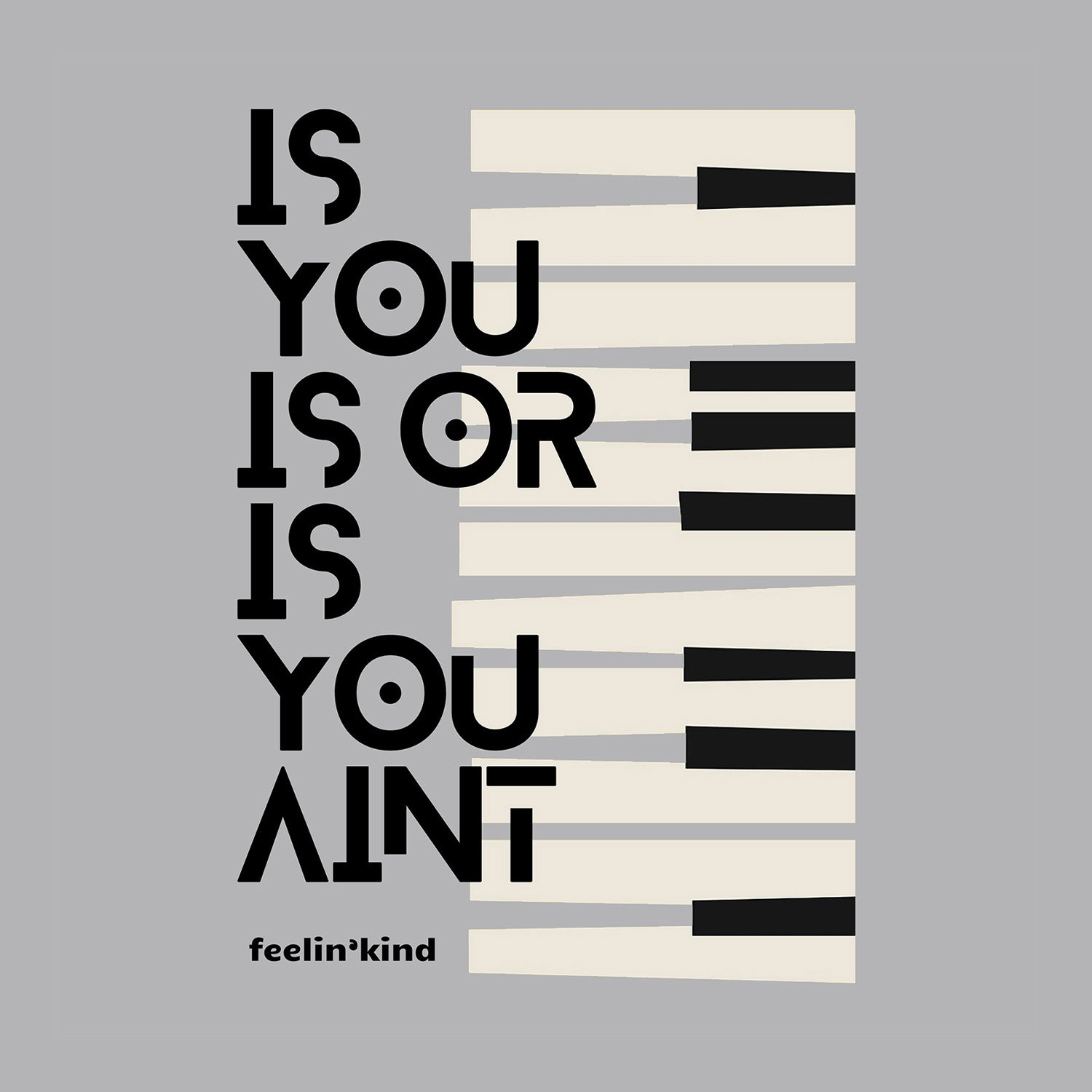 The Is You Is or Is You Ain’t Piano Collection by Feelin’Kind is where jazz culture, wordplay, and kindness collide. Featuring bold typography alongside stylized piano keys, this design is inspired by rhythm, creativity, and self-expression—with an underlying reminder to live authentically and live kind.