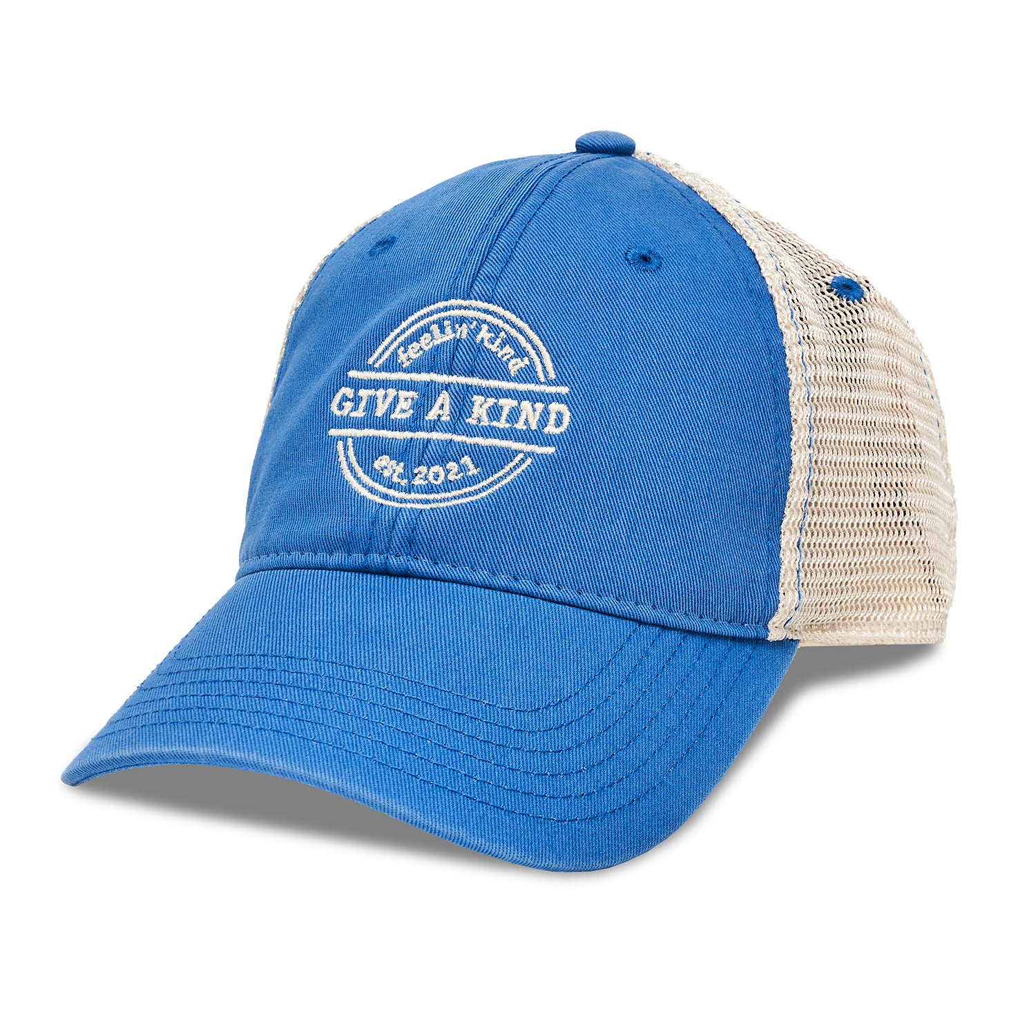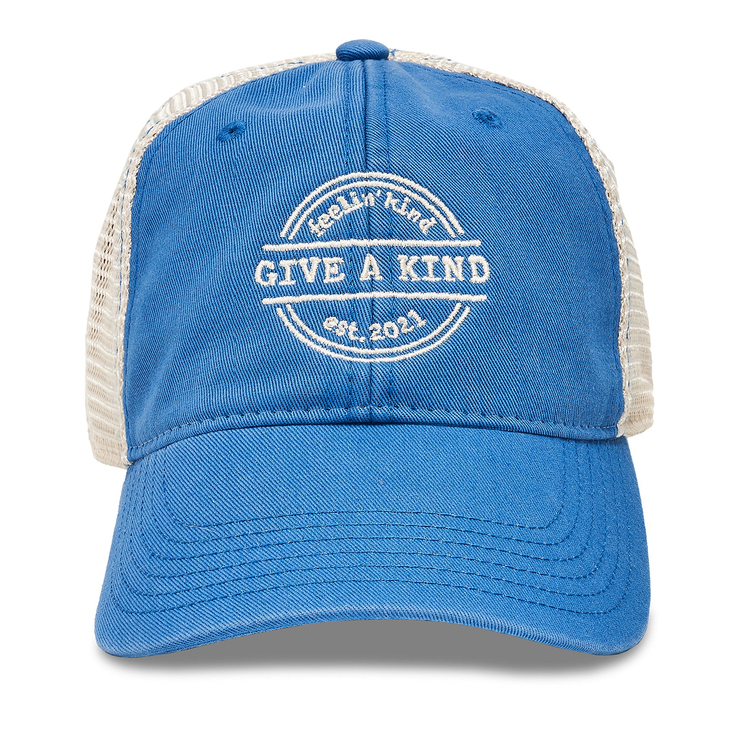 Give A Kind, need we say more? Our signature slogan on a perfectly fitted trucker hat features an unstructured crown, fully curved visor, open back snap closure and mesh back. Effortlessly cool and casual for any occasion.
