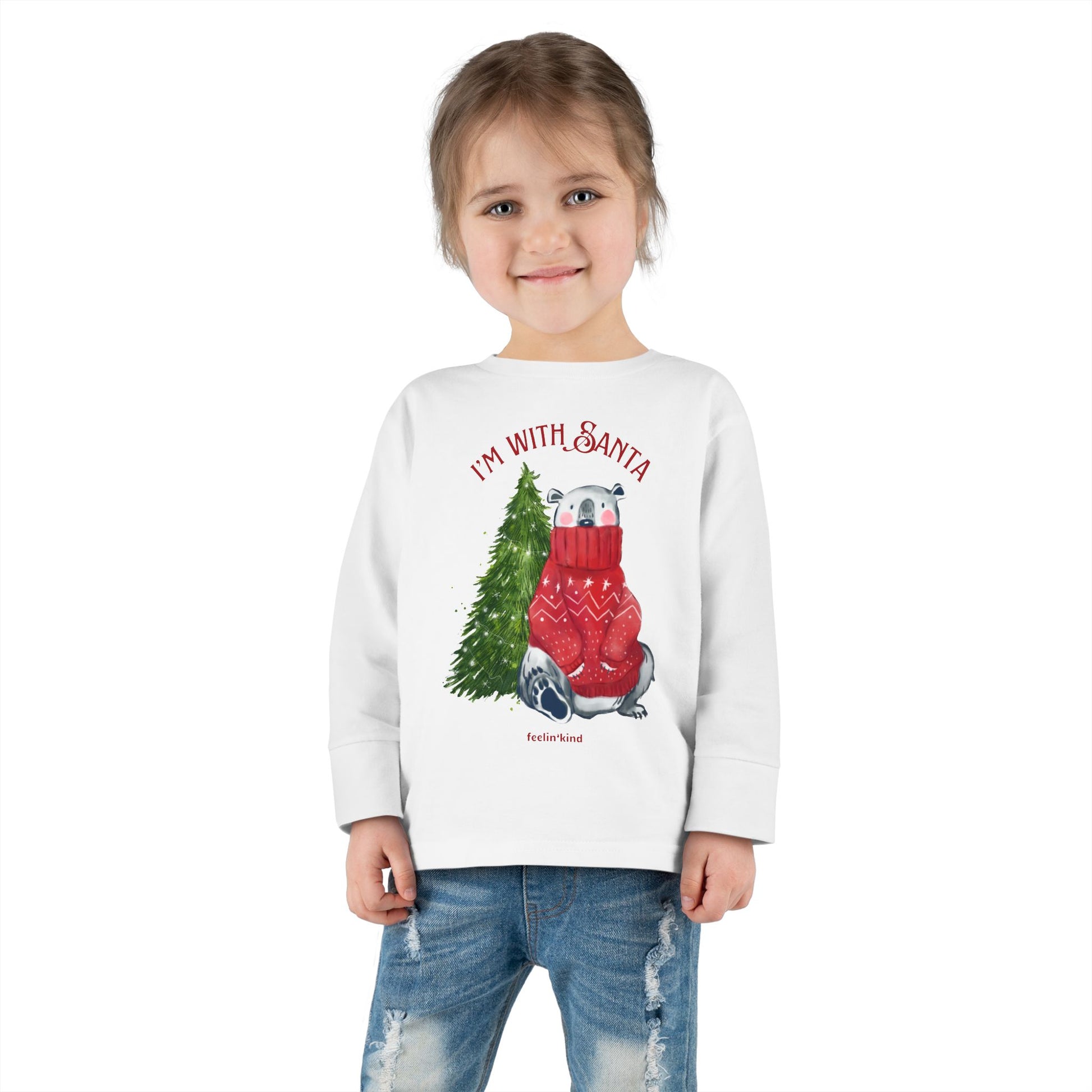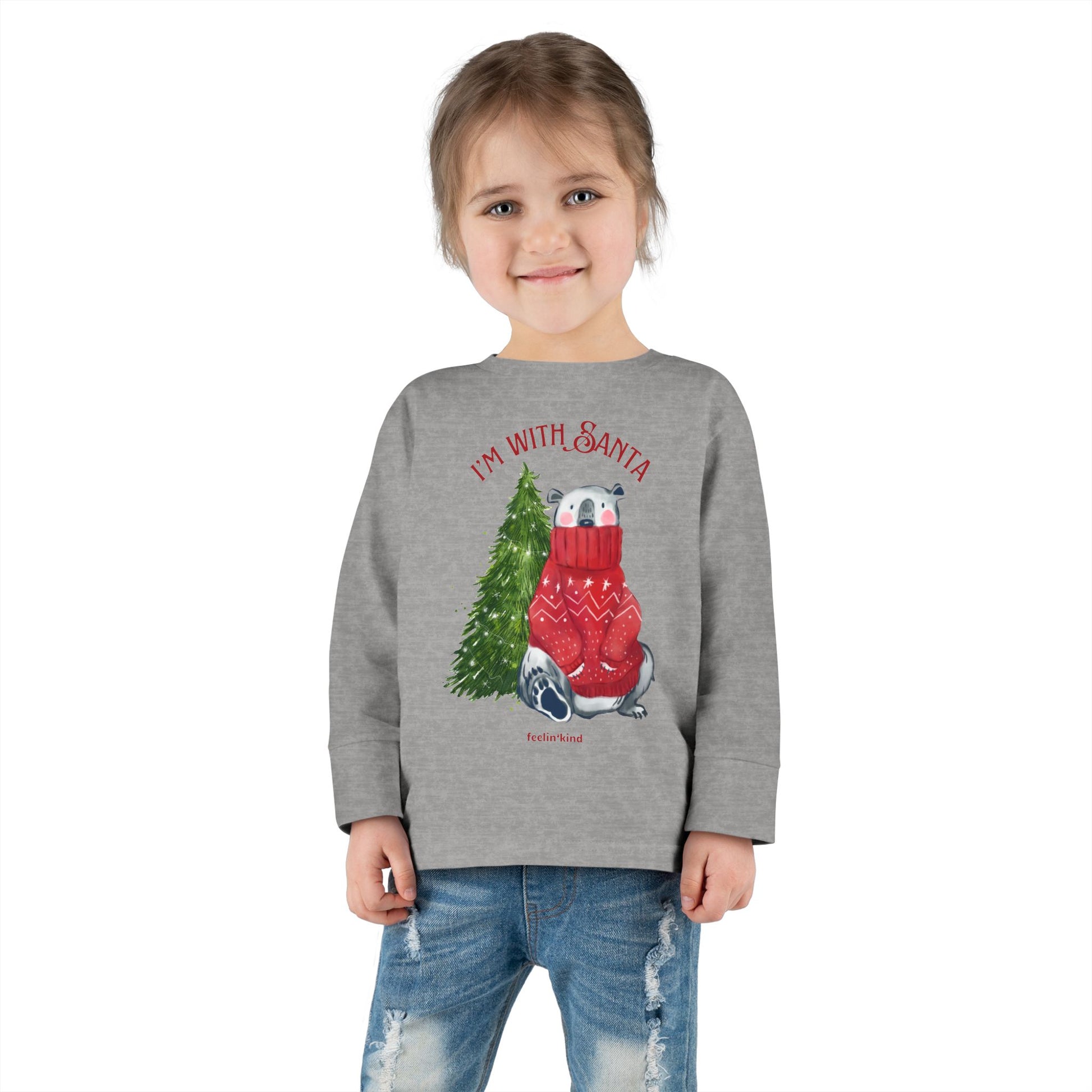 Soft, cozy, and quietly festive — this toddler long sleeve tee brings a gentle winter scene to little ones’ everyday adventures. A wide-eyed bear peeks out from a chunky red sweater beside a hand-painted evergreen, with the whimsical phrase “I’m with Santa” arched above. Lightweight and breathable, the long sleeves keep tiny arms warm during stroller walks, tree-lighting outings, and cozy mornings by the window. The cut sits comfortably on toddlers, with ribbed cuffs and collar that hold their shape through play and washes. It layers easily under snowsuits or over pajamas, adding a touch of holiday charm without overwhelming tiny wardrobes.